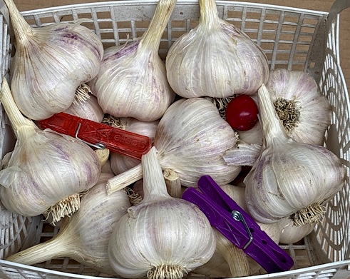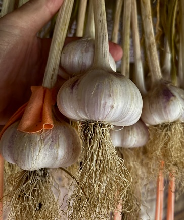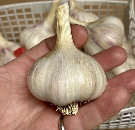Silverskin garlic grown in New Zealand will have leaves rather than a central stalk and are referred to as a softneck garlic. Bulbs have a beautiful white husk with a blush of pink. Softneck garlics usually have a longer storage life than hardnecks. Bulbs have a combination of both large cloves for planting and smaller cloves for culinary use. The Silverskin garlic that we have for sale this year will have 6 or more large cloves(some jumbo) with a minimum bulb size of 55mm.